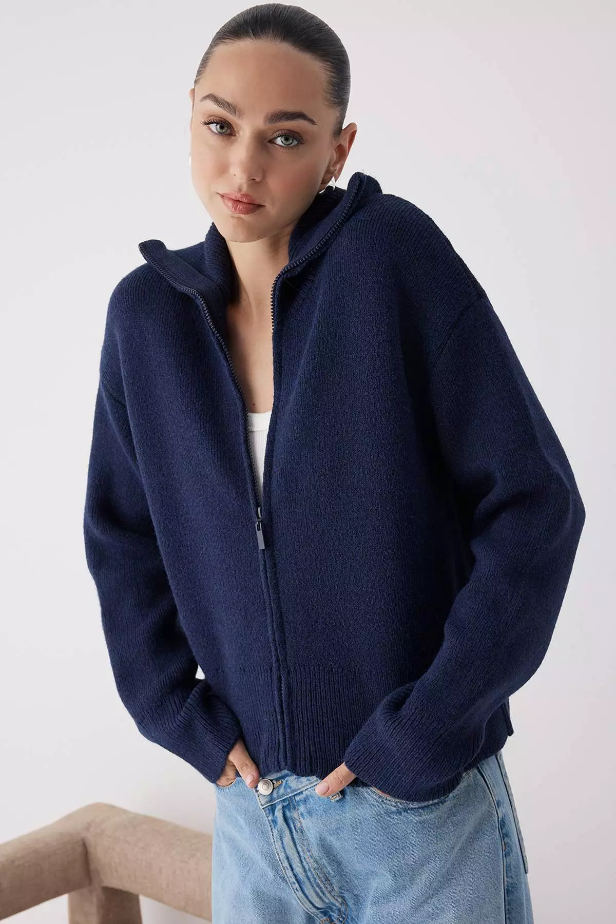 TrendyolNavy Blue Turn Down Collar Soft Texture Wide Fit Zippered Knitwear Cardigan3149.002972.00