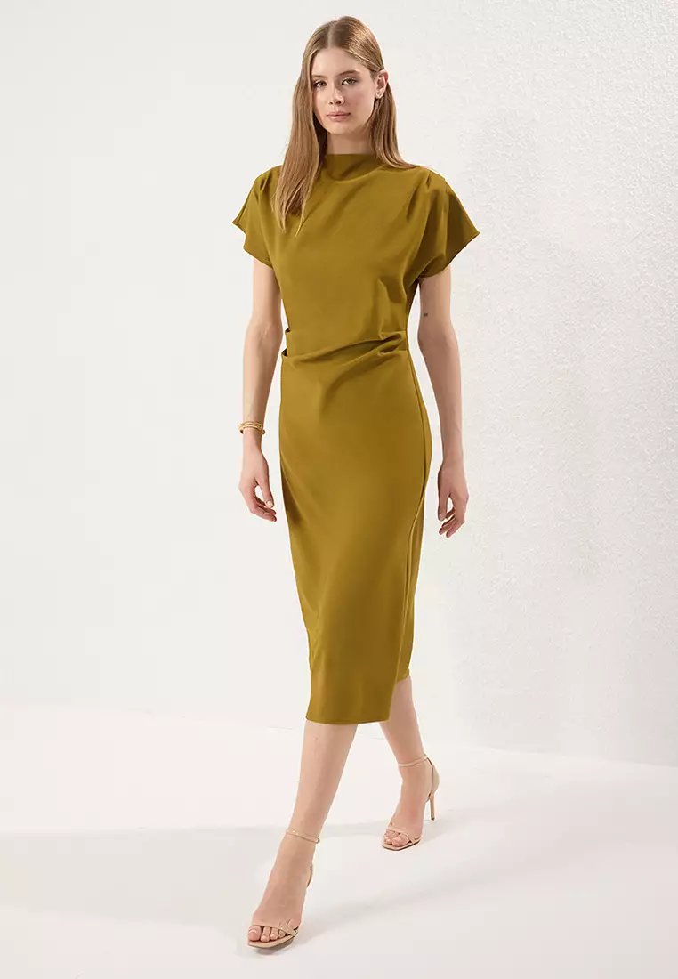 Oil Green A-Line Cowl Neck Midi Crepe Woven Dress TWOAW25EL00393