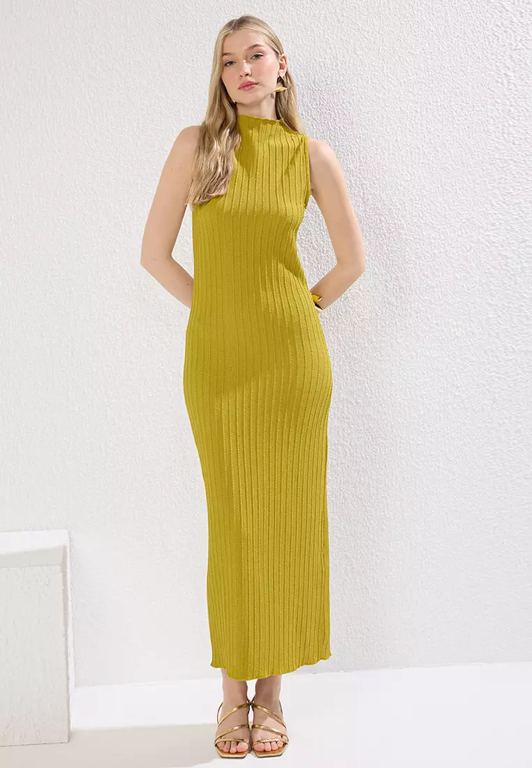TrendyolOil Green Textured Fabric Stand Collar Body-Smoothing Flexible Maxi Knit Dress TWOSS25EL001631999.001157.00