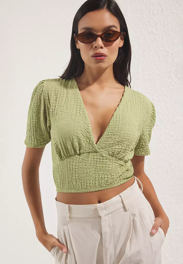 TrendyolOil Green Textured V-Neck Double Breasted Closure Balloon Sleeve Crop Knitted Blouse Twoss25Bz00542649.00