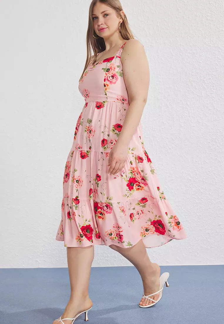TrendyolPink Floral Strappy Midi Summer Woven Plus Size Dress Tbbss25Ah001042609.001670.00