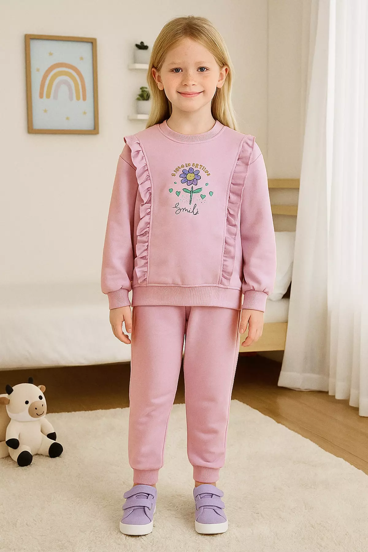 Pink Flower Patterned Girl's Pajamas Set - Knitted Set Tkdaw25Au00077