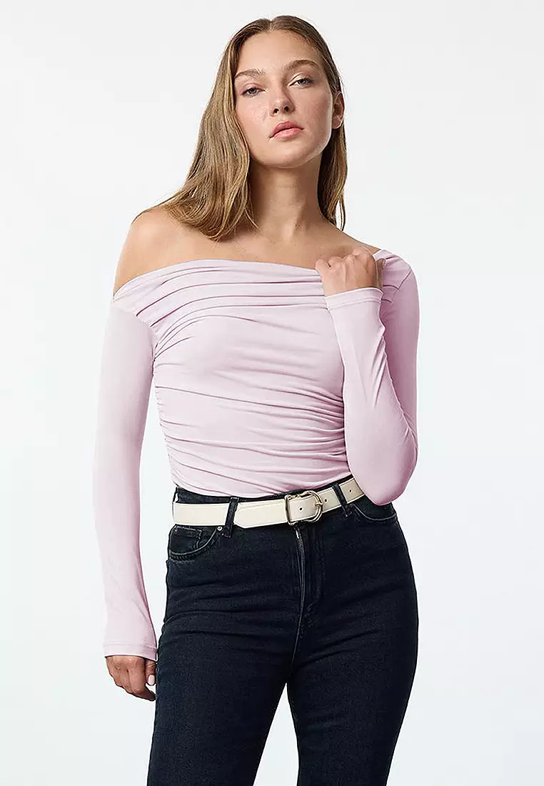 Pink Gathered/Draped Detailed Fitted Long Sleeve Flexible Knitted Blouse