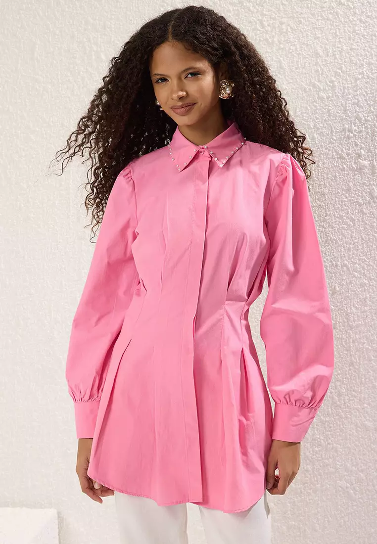 Pink Waist-Sit Pearl Detailed Woven Shirt Tctaw24Tg00027