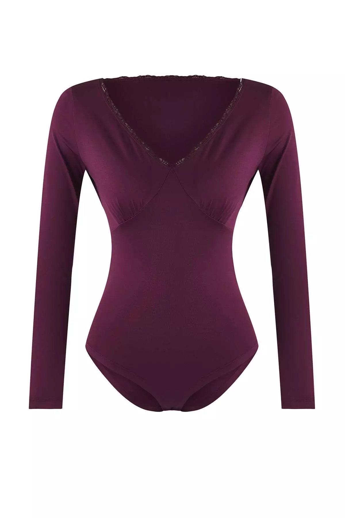 Plum V-Neck Lace Detailed Snap-Flex Knitted Bodysuit