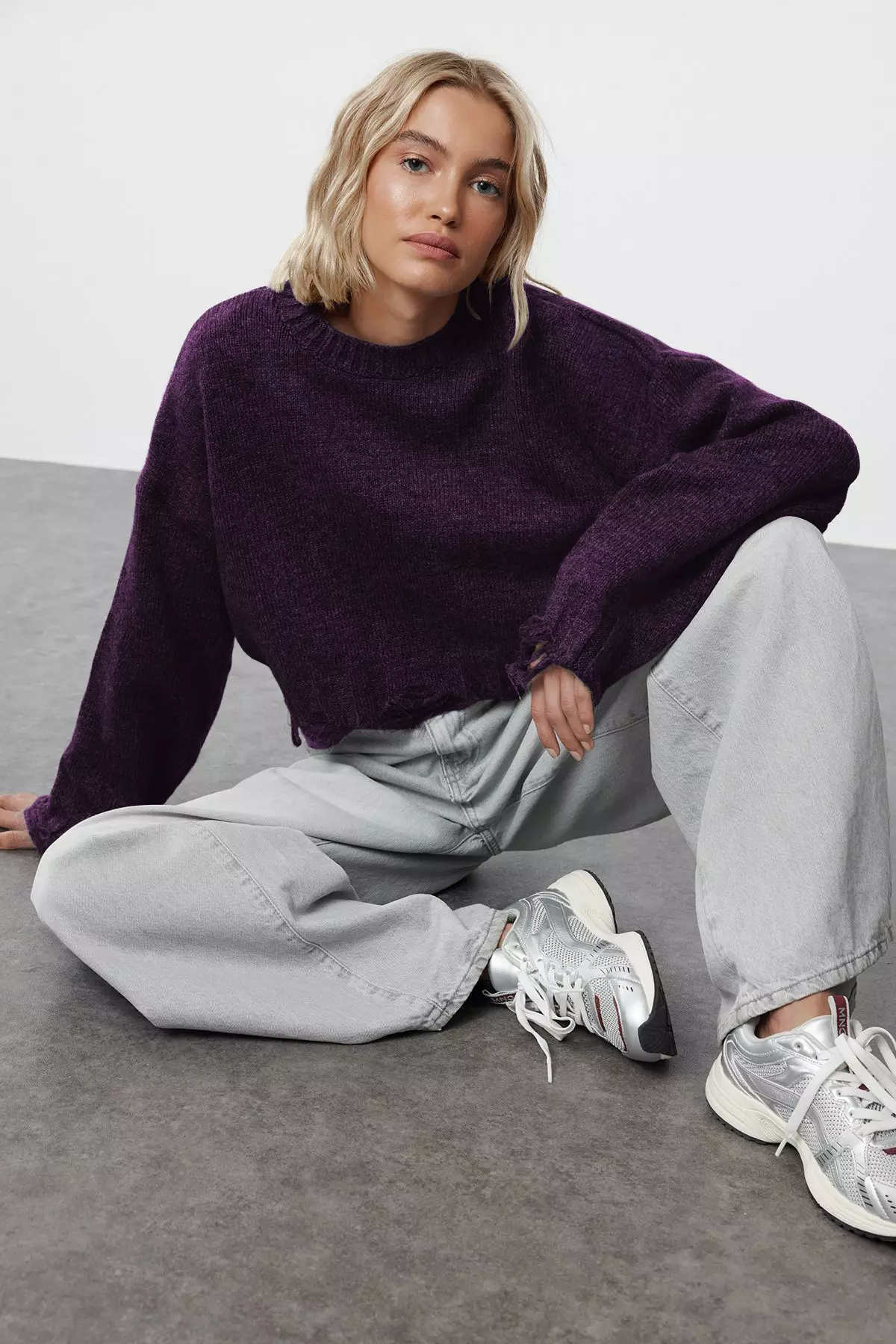 Purple Crop Wide Fit Soft Textured Pullover Detailed Sweater
