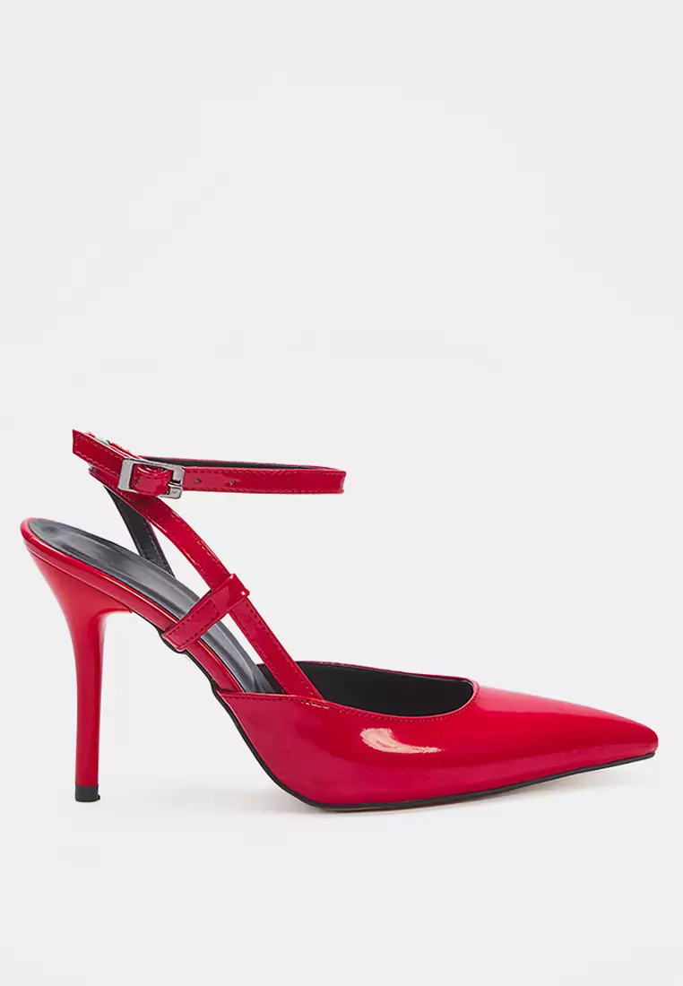 Red Patent Leather Ankle Strap Pointed Toe Women Classic Thin Heels Shoes Takss25To00081