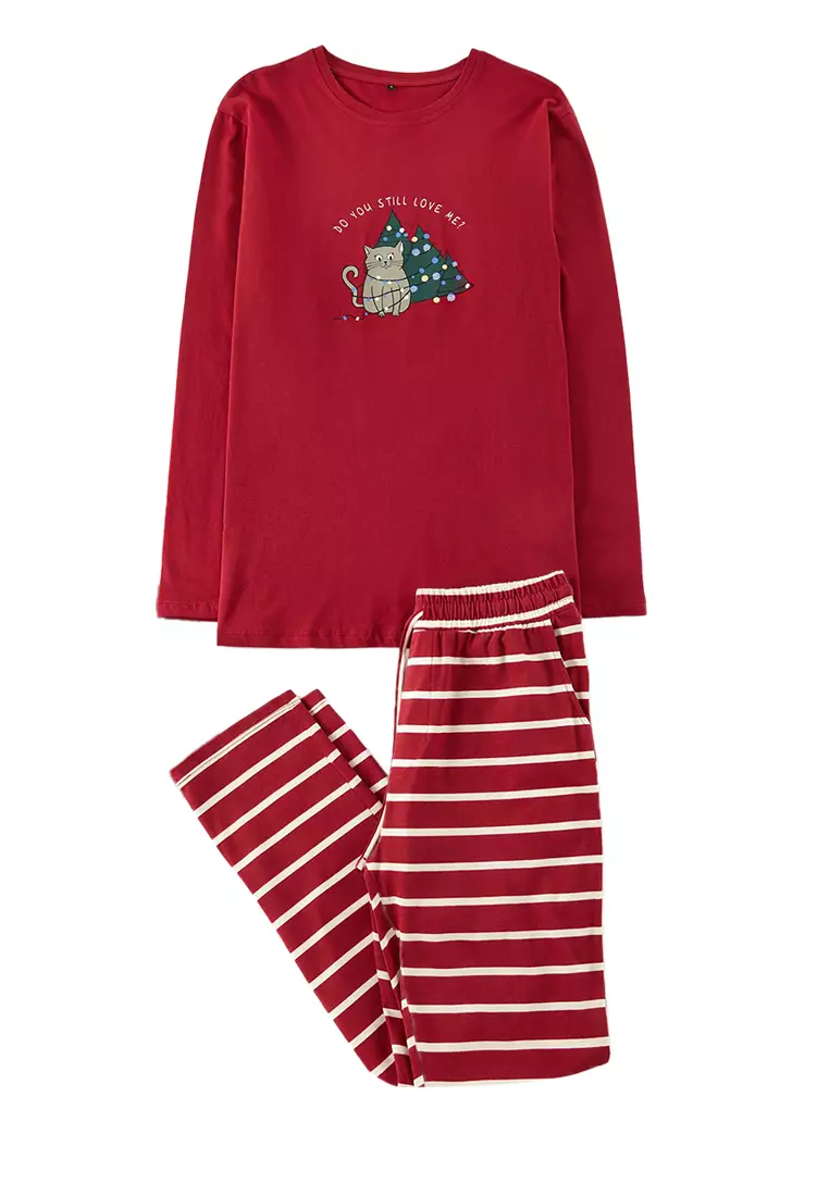 Red Striped Regular Fit Couple Christmas Themed Knitted Pajama Set TMNAW25PT00045