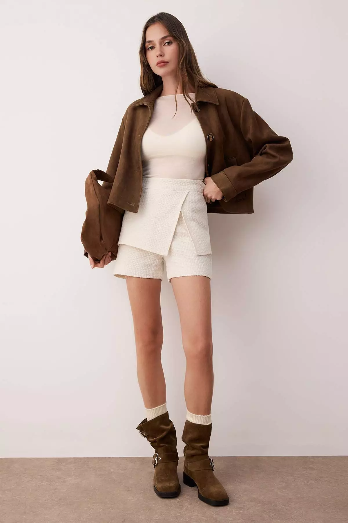 Stone Woven Tweed Skirt-Look Shorts