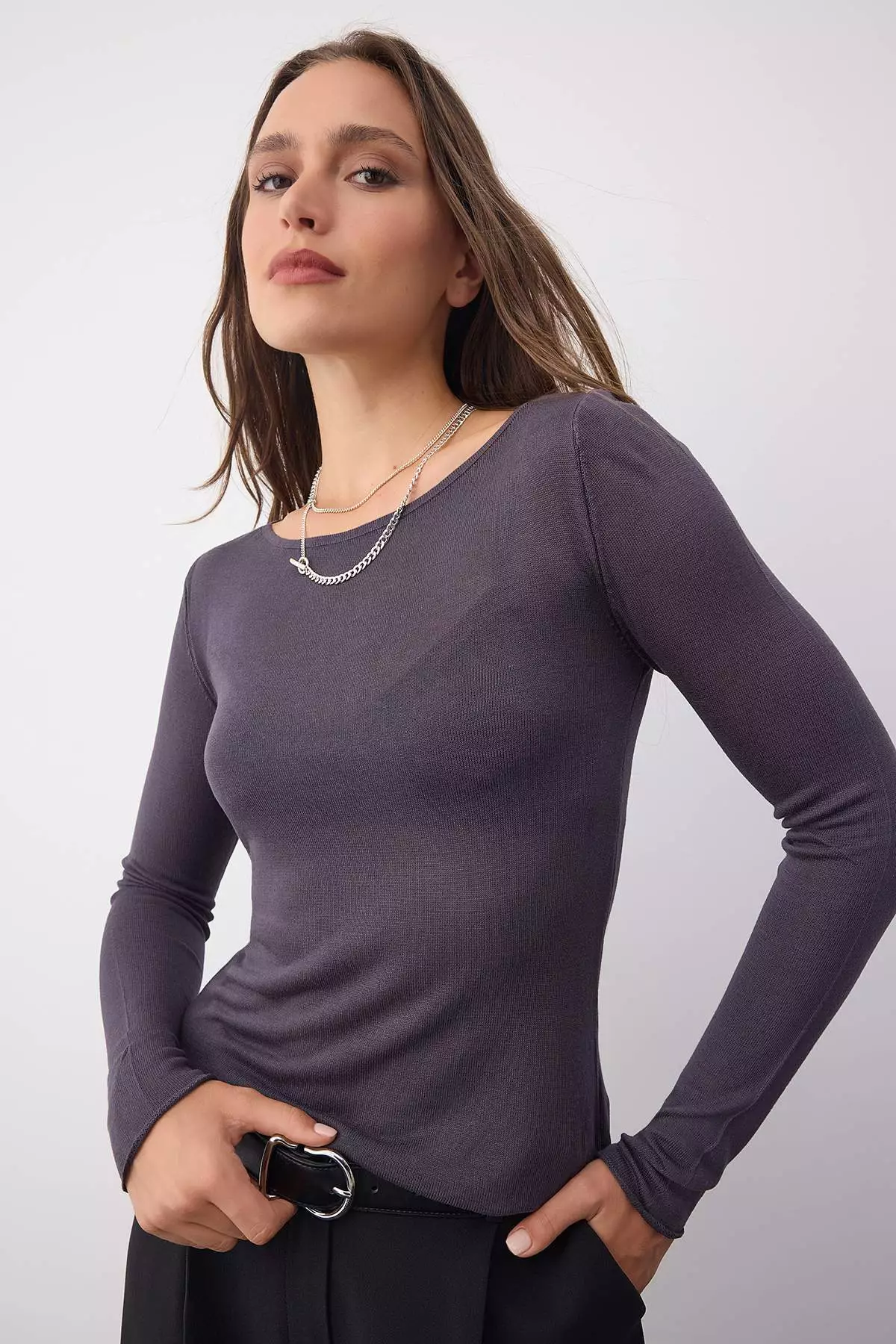Wardrobe Essentials Anthracite Basic Thin Knit Sweater | Twoaw26Kz00112