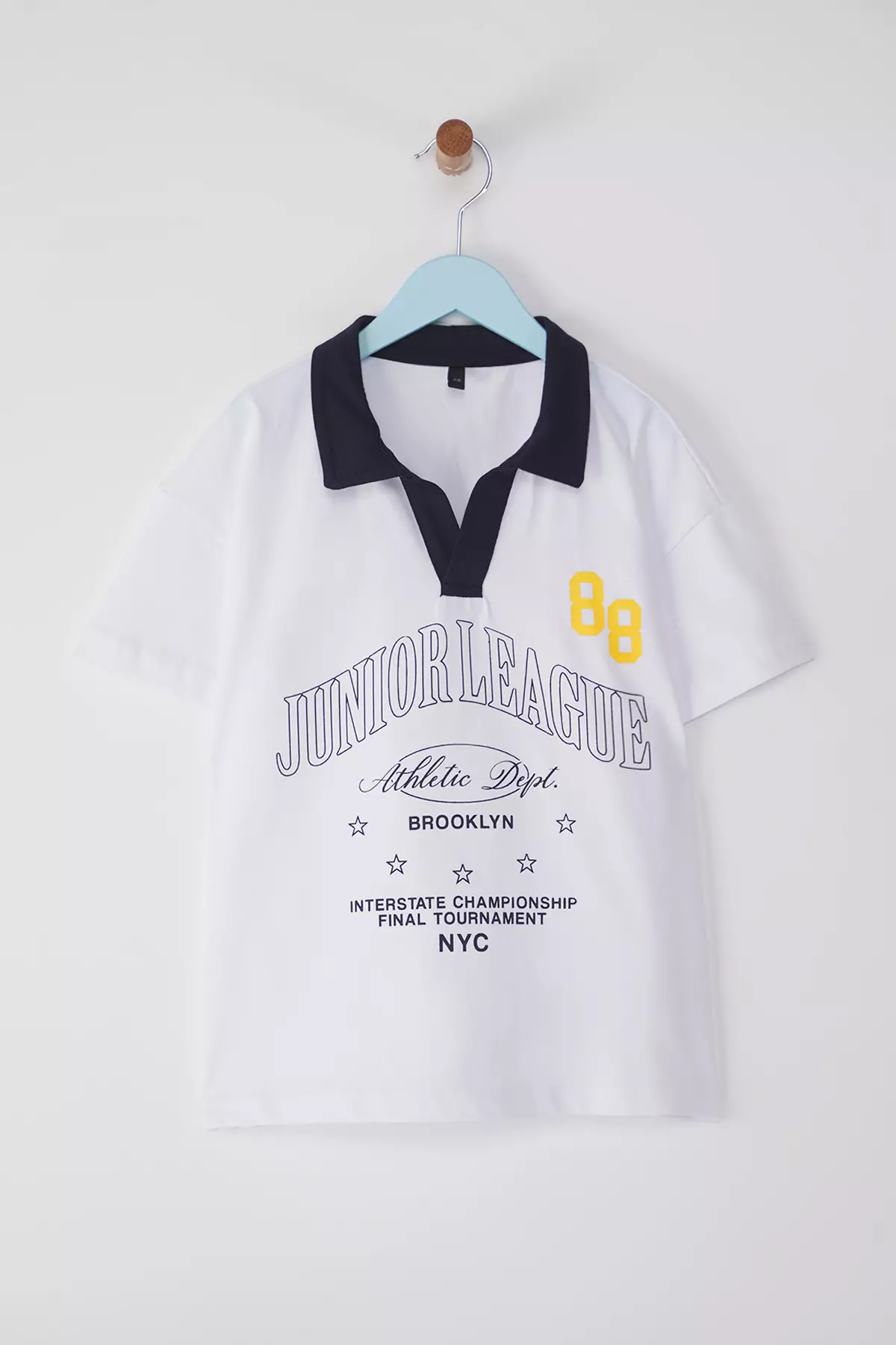 White Boy's Polo 100% Cotton Slogan Printed Collar Short Sleeve Knitted T-Shirt