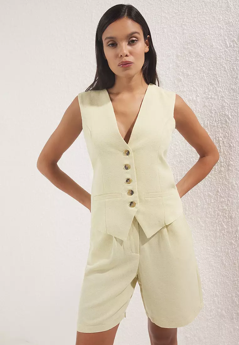 TrendyolYellow Linen Look V-Neck Vest and Shorts Woven Double Bottom-Top Set TWOSS25AU000418289.00