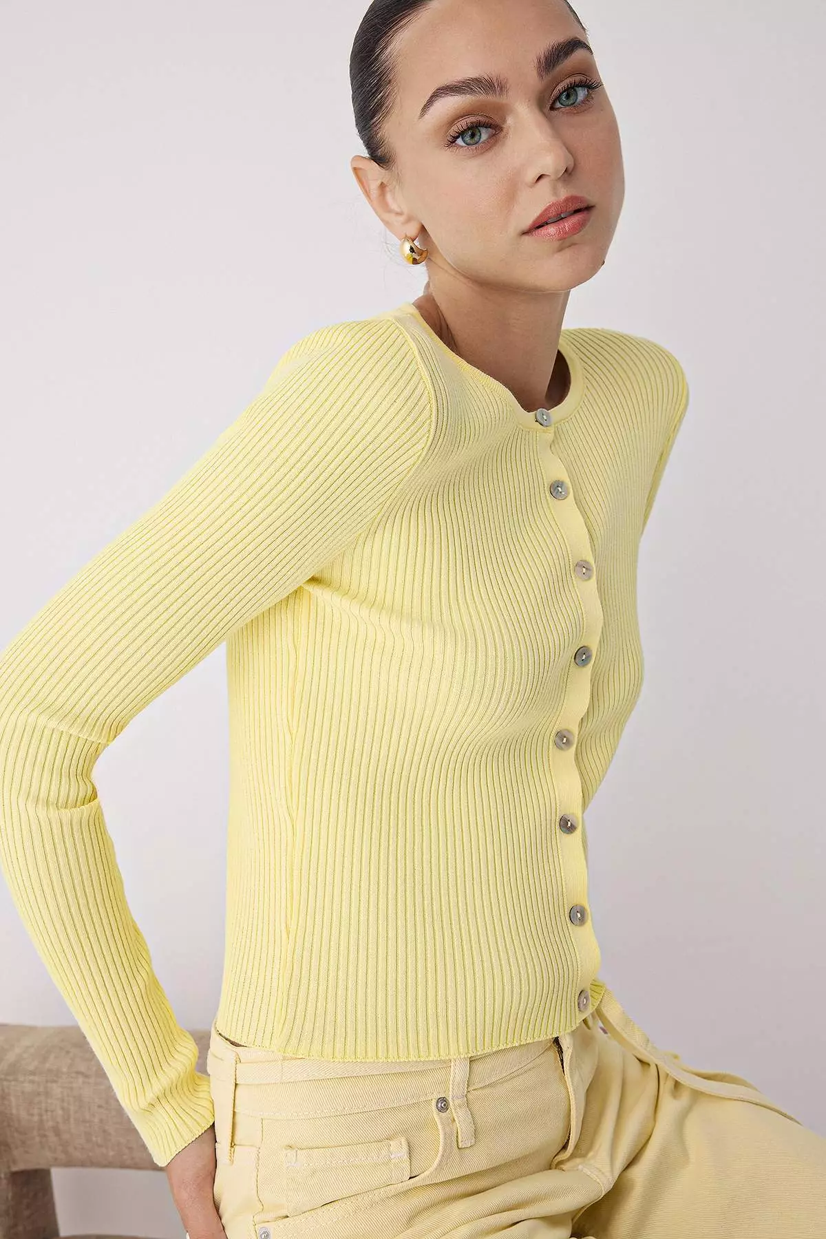 Yellow Mercerized Look Ribbed Knitwear Cardigan