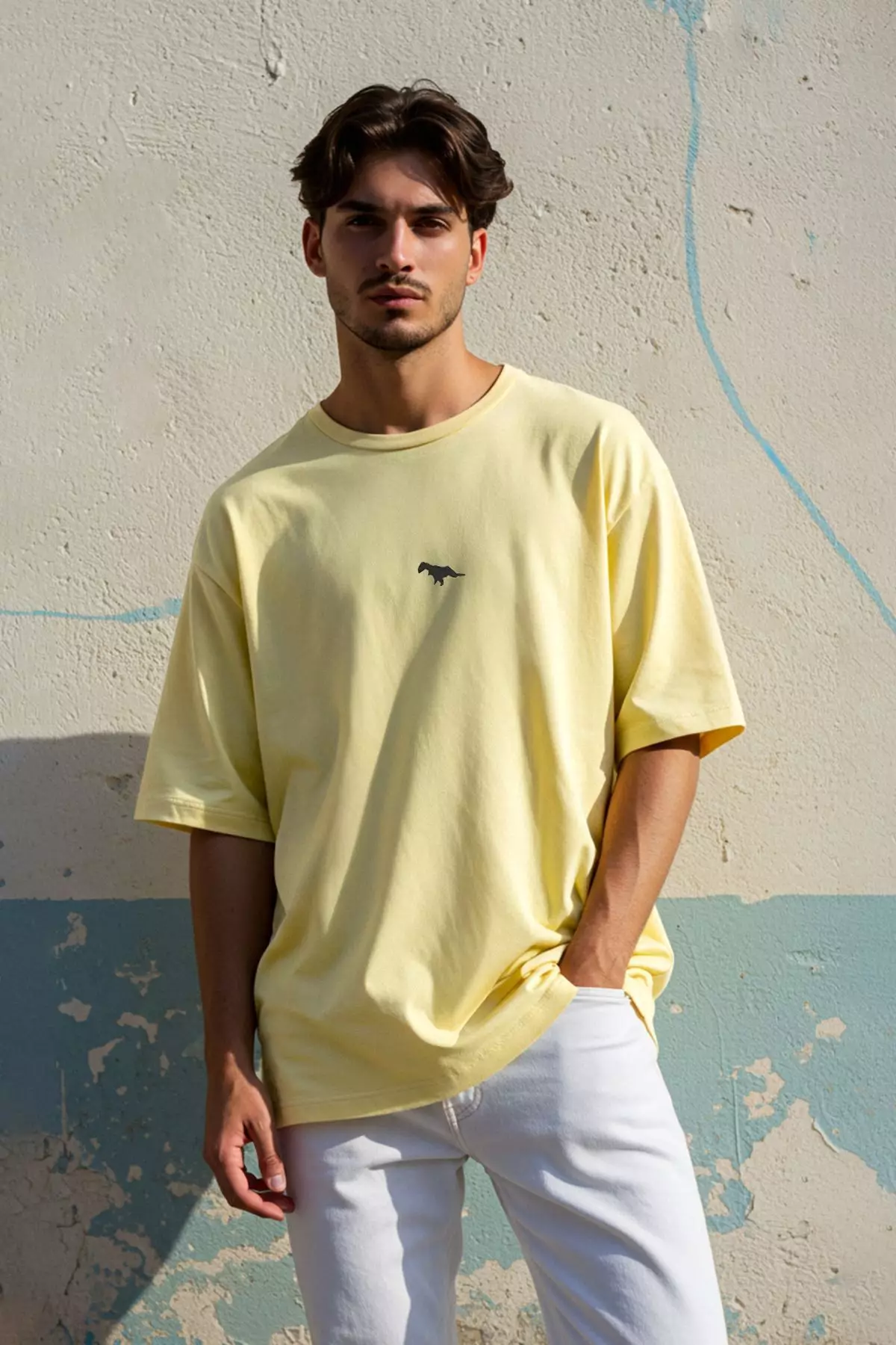 Yellow Oversize/Wide Cut Short Sleeve Dinosaur Embroidered 100% Solid Fabric T-shirt TMNSS23TS00243